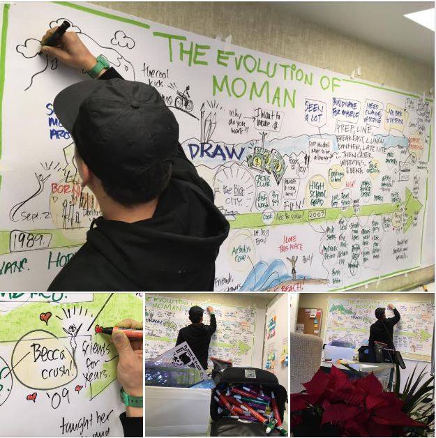 Another productive morning with Mo Dawson at the wall. Today I drew out the content of his life (to demo live spontaneously created work). And then sat back as he added more illustrations and colour to my base. His homework is to study module 6 (formats) and module 10 (facilitation with visual templates) in my Home… Read more »