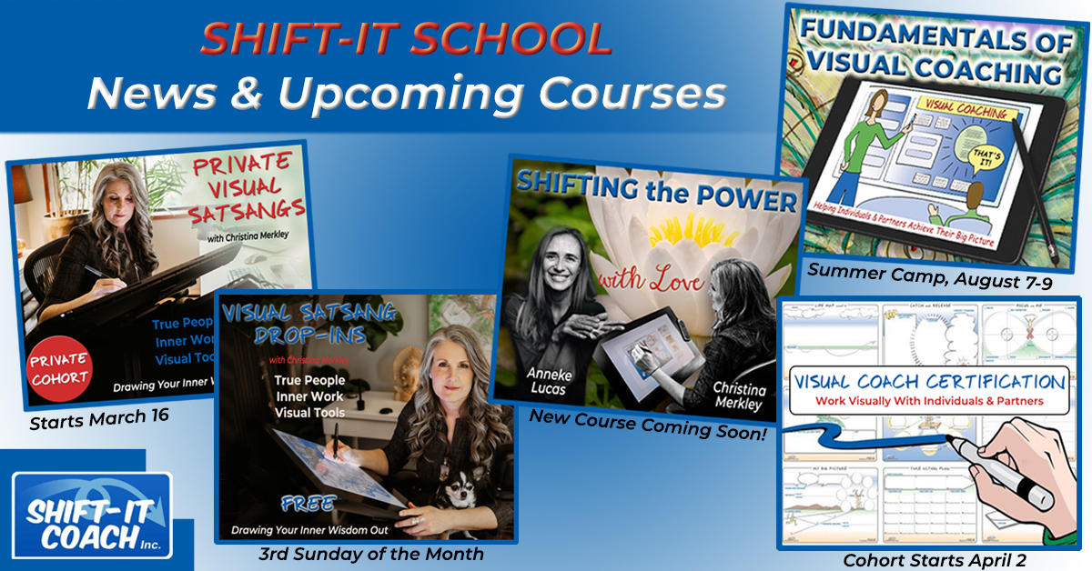 ONLINE COACHING AND PROCESSING: Private Sessions One-to-one with Christina Merkley via Zoom. Public Visual Satsang – Free 3rd Sunday of each month. Times vary. Next Gathering: Sunday, December 17, 2023 1:00 – 3:00 pm Pacific Time, convert to your zone SHIFT-IT: Online Visual Coaching Retreat Save 50% Spring 2024 (Extended Format): January 20 – March… Read more »