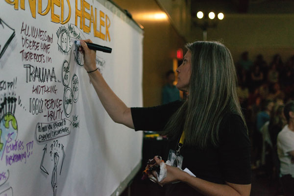 If you are aware of the SketchNotes technique, it’s the same idea, but larger and with the notes happening publicly rather than in your own small notebook.