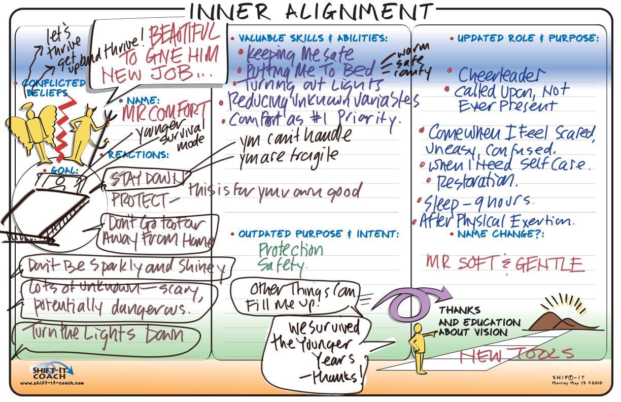 And another Member to renegotiate an aspect of her consciousness that literally put her to bed whenever she felt scared, uneasy or confused. We mediated a new role where sleep plays a more appropriate role in her life now that she has survived her younger years and has moved into true thriving. The Inner Alignment exercise and map is included in my SHIFT-IT Visual Coaching System.
