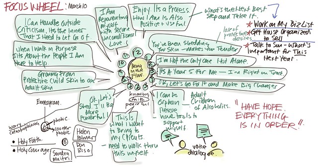 Our second member was in touch with her tendency to worry and catastrophize. Knowing her (and also paying close attention to her specific words and energy today) I briefly explained Enneagram Type 6 and gave recommendations for further study. We then progressed through a Focus Wheel – a technique from Abraham-Hicks, which helped soften and soothe her initial feelings and got her in touch with Faith, Courage and Taking Action. She narrowed her plan down to what she can do this year. And left feeling a whole lot better than she entered!