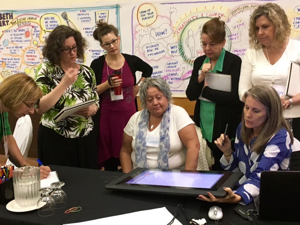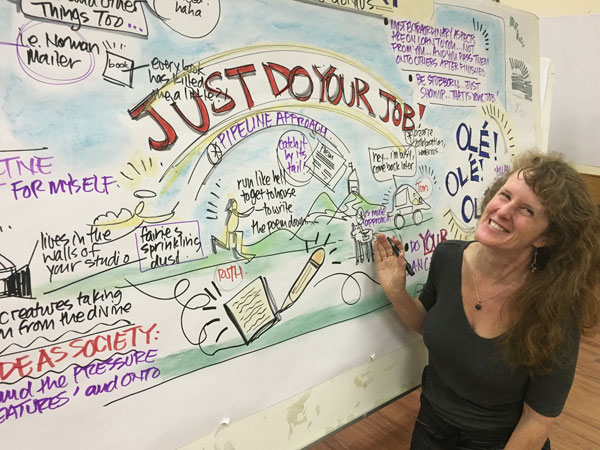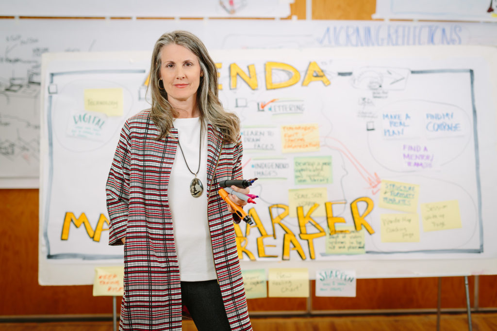 Developing the visual and business skills necessary for a successful practice can be challenging to do in isolation. It takes chutzpah to stand at a wall (or scribe on a tablet) for all to see. And to work through your art, visibility, comparison-itis, money and technology issues. These are ever-evolving and developing skills. It really helps to have a seasoned mentor and group of keen peers to help you through the inevitable bumps. That is what my Magic Marker experiences are about – providing a smart and supportive environment for your continued evolution.