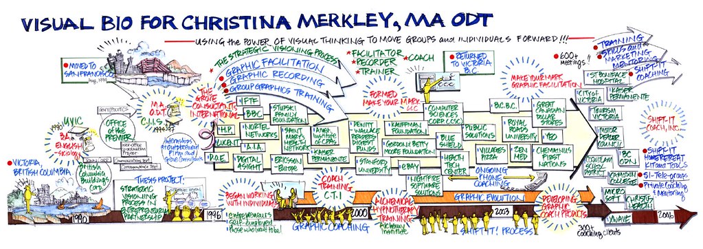 I first did an internship with The Grove (having lucky timing which coincided with the launch of their Strategic Visioning tools). Then was hired as support to the consulting unit. Eventually I was given my big break and emerged as an in-house Graphic Recorder, traveling North America and internationally (in corporate, governmental and not-for-profit settings mostly working in strategic planning and visioning venues). In 2001 I set off on my own, creating Make Your Mark, LLC.