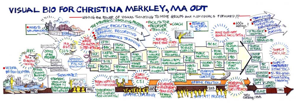 In 1994 I left Canada and moved to San Francisco, California, U.S.A. to pursue my masters in Organizational Development & Transformation at The California Institute of Integral Studies. During grad school, at the insistence of a friend who knew I could doodle, I was introduced to the pioneering ‘Group Graphics’ work of David Sibbet and The Grove Consultants International. Upon viewing David’s change management work involving interactive visual displays … well, it was love at first sight! My left-brain love of organizations and business came together with my right-brain love of color, emotion and illustration in one fell swoop.