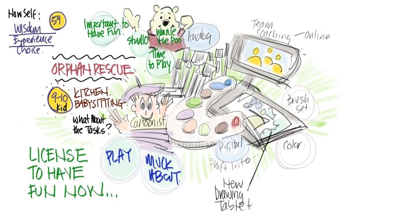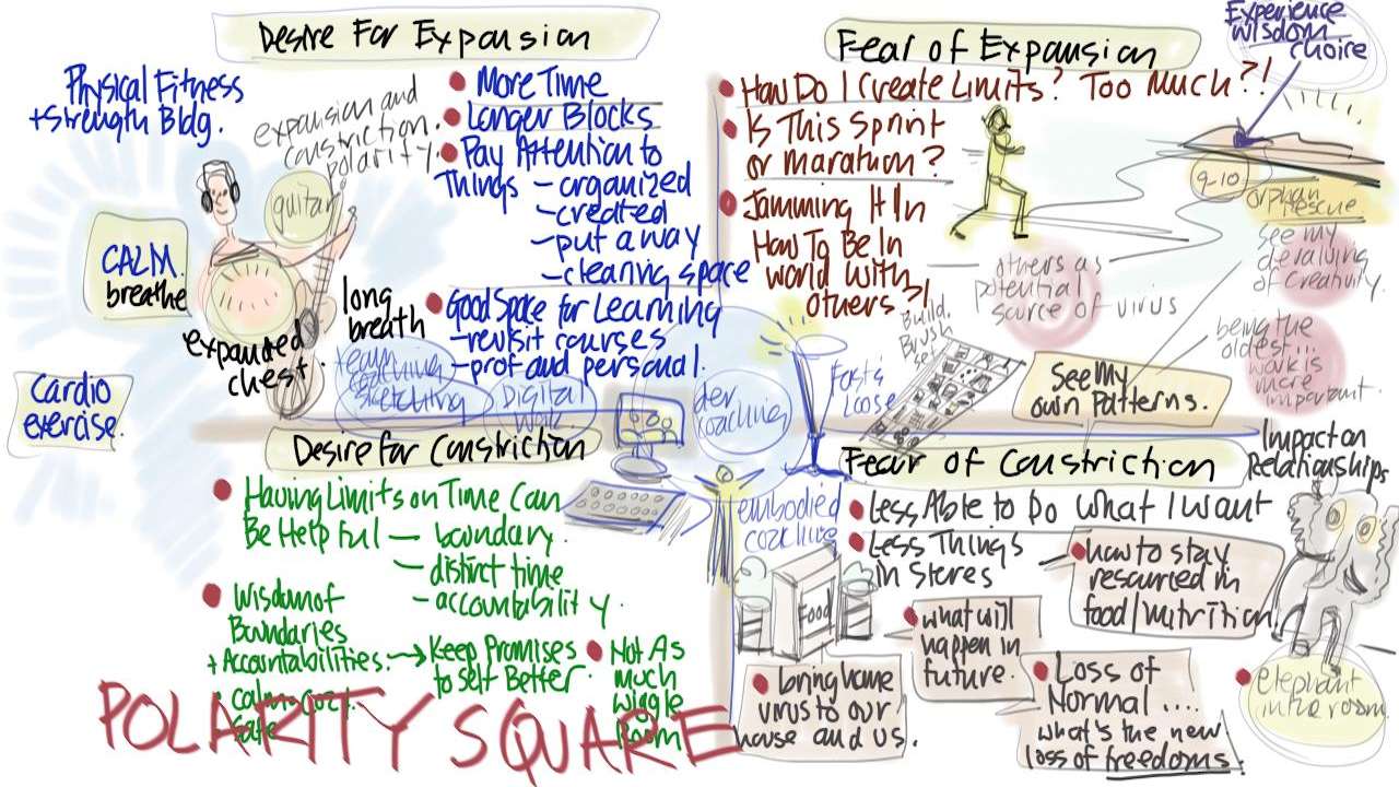[Visual Coaching with Christina Merkley – COVID Pandemic #8]. Like many of us Joan has a love/hate relationship with the pandemic lockdown. We found it through her expansion-constriction polarity. Then we discovered a very important Orphan. Her 9 year old self who valiantly (and tragically) sacrificed her creativity (and other fun kid stuff) to fulfill the tasks of a sick parent. How key to finally rescue her. May the Cartoonist within you be rebirthed Joan – markers up!