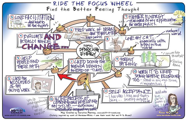 2. Evaluator in Canadian Federal Government weaving ‘working visually’ into her work. Started with Studio Work (good response). Then Graphic Facilitation using templates (likes the process and aesthetic control). Recently tried public Graphic Recording. While participants appreciated her work her own gremlin was harsh. Christina facilitated her through a Focus Wheel to find her ‘sparkling energy … where in work and life does she feel best? She decided to keep going with Graphic Recording (the only out is through). To develop more self-acceptance and to focus on the usefulness of the medium and why she is doing it … rather than on ego and accolades.