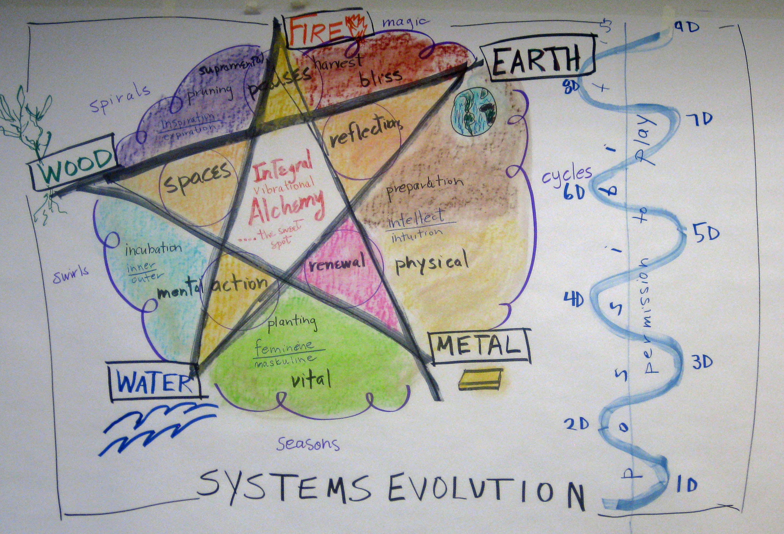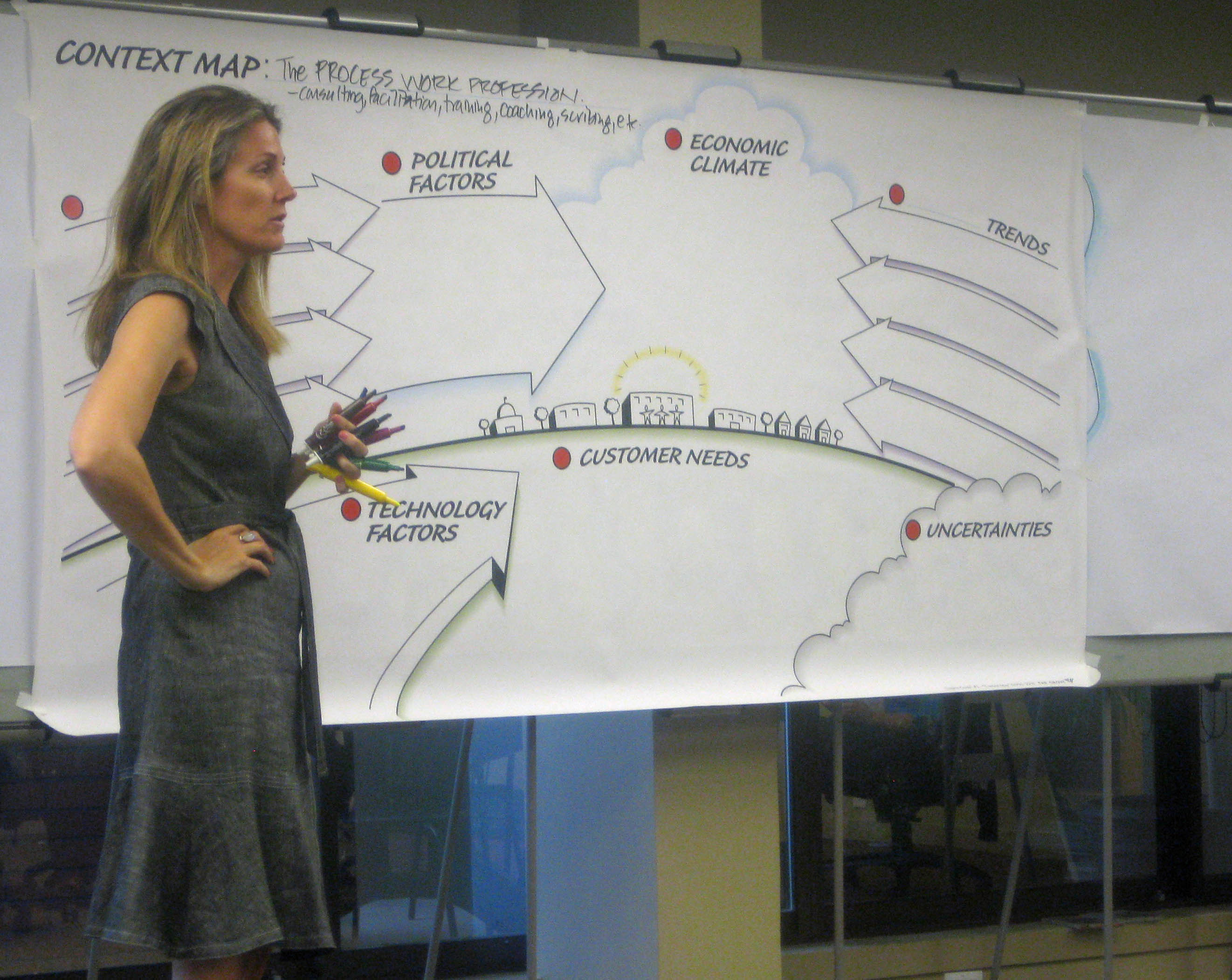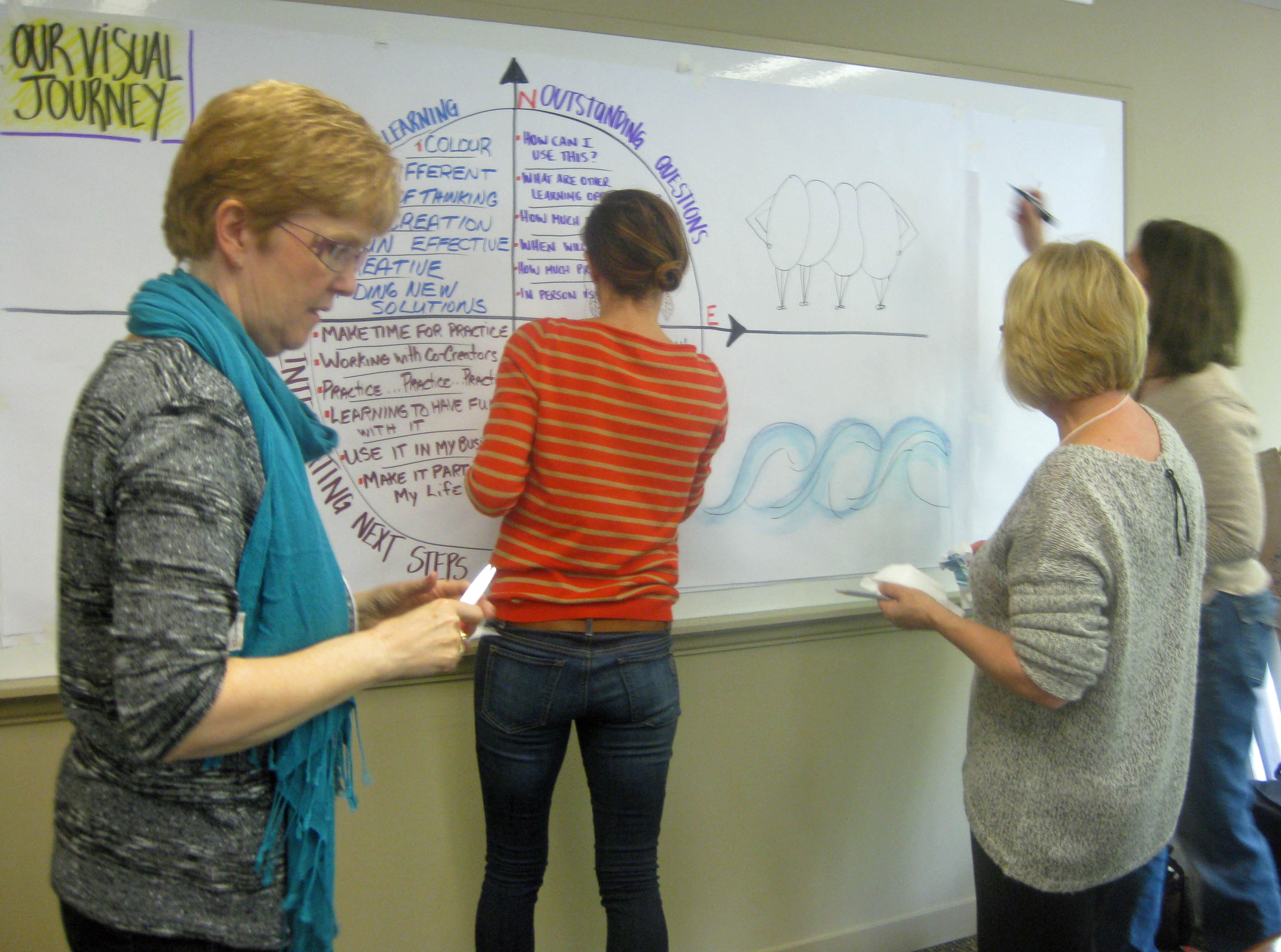True Graphic Facilitation is holding the space to help your groups think effectively and CO-BUILDING visual displays of thinking, WITH your group (not just being off on the side silently following behind them taking visual notes). Its front and center. Its interactive. And its about PROCESS first … not art. Any visuals used are aids for guiding process and collecting (and reflecting) the info generated by the client.