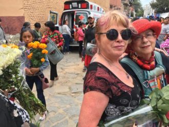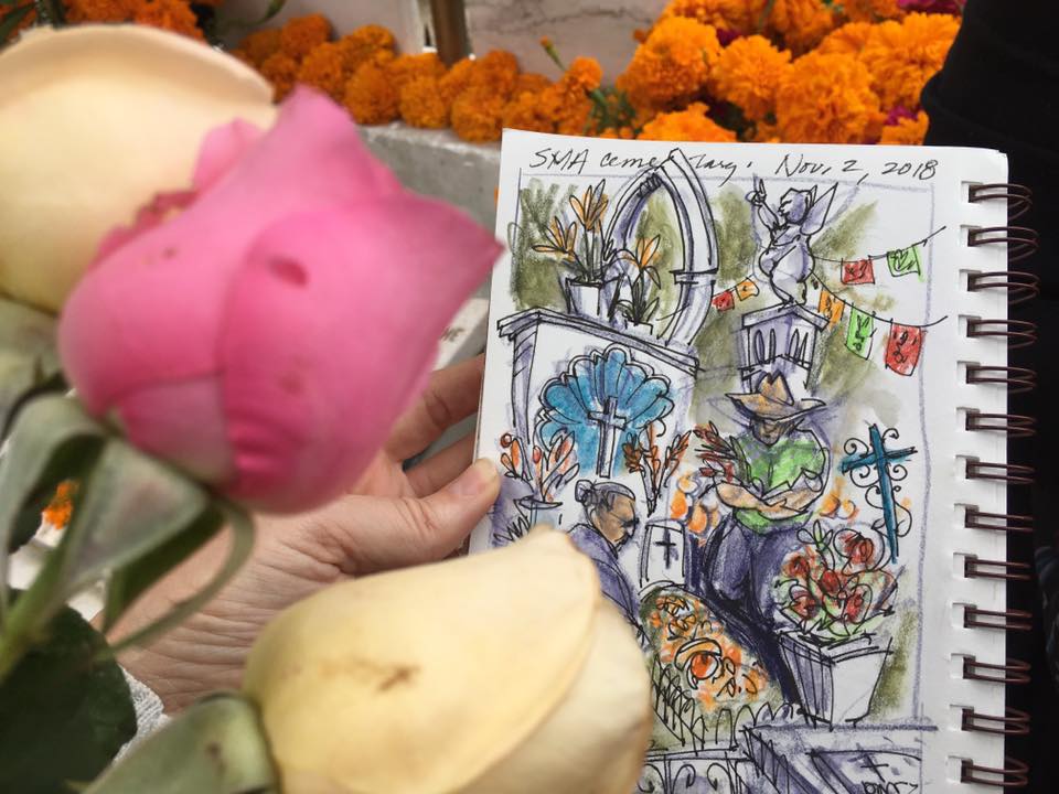Rhoda Draws’s lovely sketch from the cemetery. Very poignant day as deceased loved ones are remembered and graves festooned with flowers, sugar candies, fav foods and the like. With roving bands and guitar players. A riot for the senses both physical and subtle. |