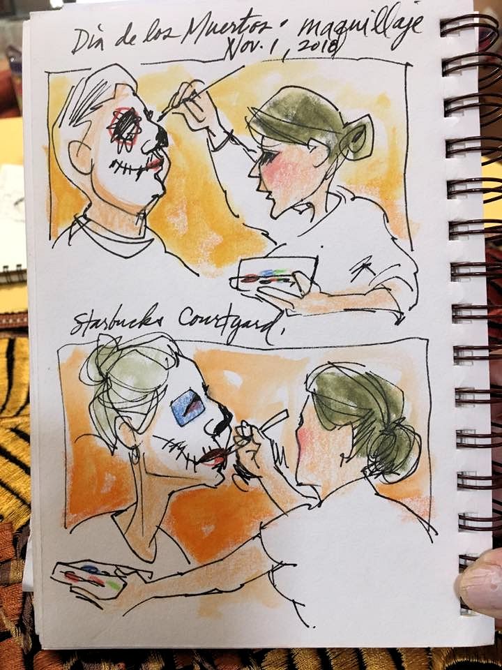 Rhoda Draws her composite sketch from various elements from Day of Dead evening. I made it into one of her sketches … can you spot me? |