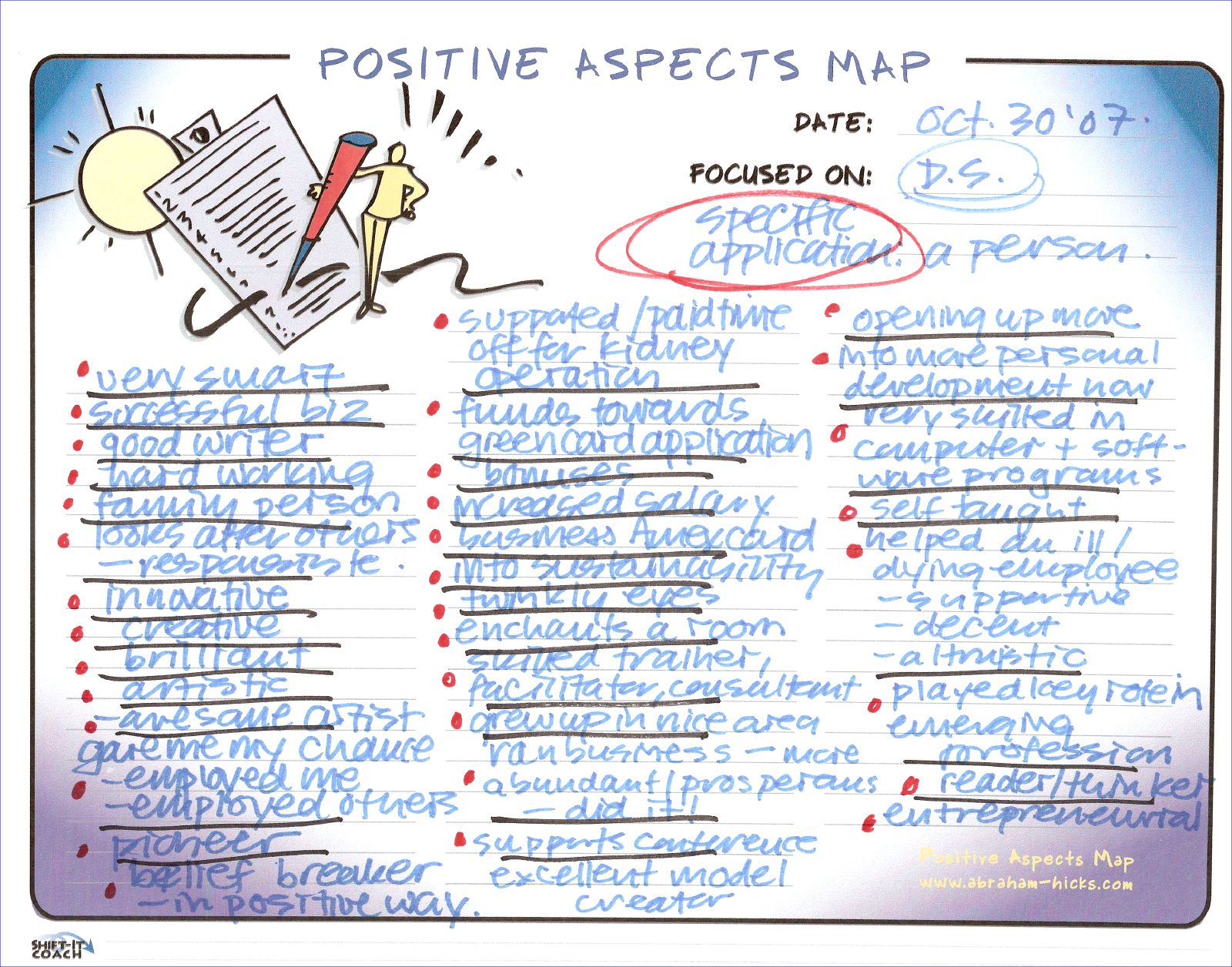 Below is an image of a positive aspects map that I have used to list out positive aspects of my past (this is an example of using Positive Aspects generally). By going through the process of creating this map, I have forced myself to cull out things that make me feel good. I have in effect deliberately milked a positive vibration out of myself. I have SHIFTed my vibe (at least a little tiny bit – and the tiny bits count in LOA work!). You can do the same!