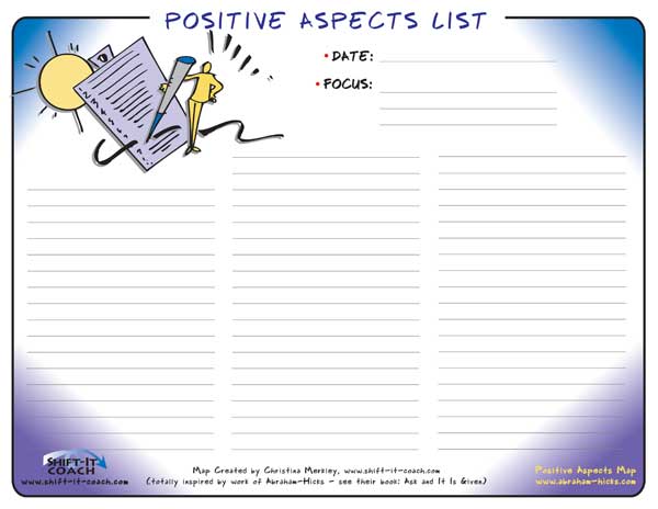For more in-depth information on Positive Aspects and other powerful Law of Attraction methods, I suggest reading the Abraham-Hicks book called Ask and It is Given.