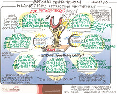 Facilitated a very inspiring tele-session on Thursday with two powerful Vancouver coaches (Denise and Theresa) who are building a coaching, speaking, facilitation practice for First Nations and relationship systems work called Chameleon Strategies (strategies for creative change). They asked me to guide them through some visioning work on their partnership and create a graphic record of the session (a Visual Vision statement that they can use as a North Star kind of guidance for themselves). We did a number of different things, culminating down to this draft 1.0 Magnetism Map of a one year Vision for them (a timeframe that felt intuitively right for them rather than going for a further stretch in time).