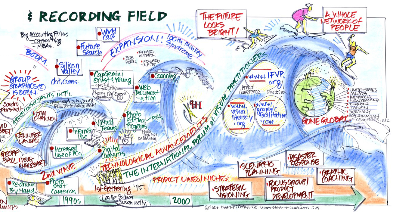 At the dawn of this new millennium, there is a growing field of ‘visual practitioners’ moving steadily across the international landscape. Comprised of people calling themselves graphic facilitators, graphic recorders, visual synthesizers, mapmakers and the like … these people are all using visual approaches with varying levels of interaction to assist groups and individuals in thinking, communicating, sharing and making decisions.
