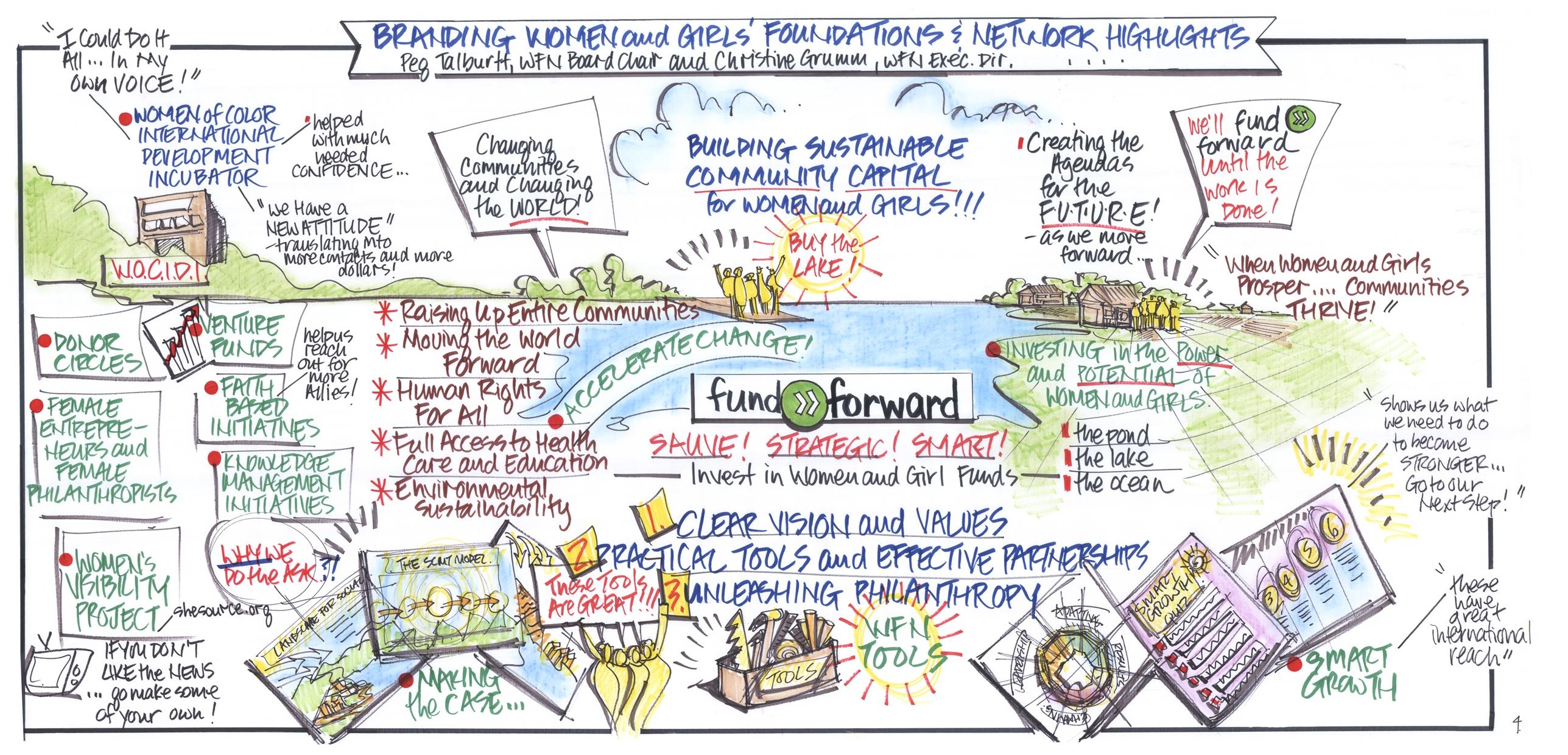Above is an example of graphic recording work, done for a women’s funding conference — it’s the highlights of a talk on branding.