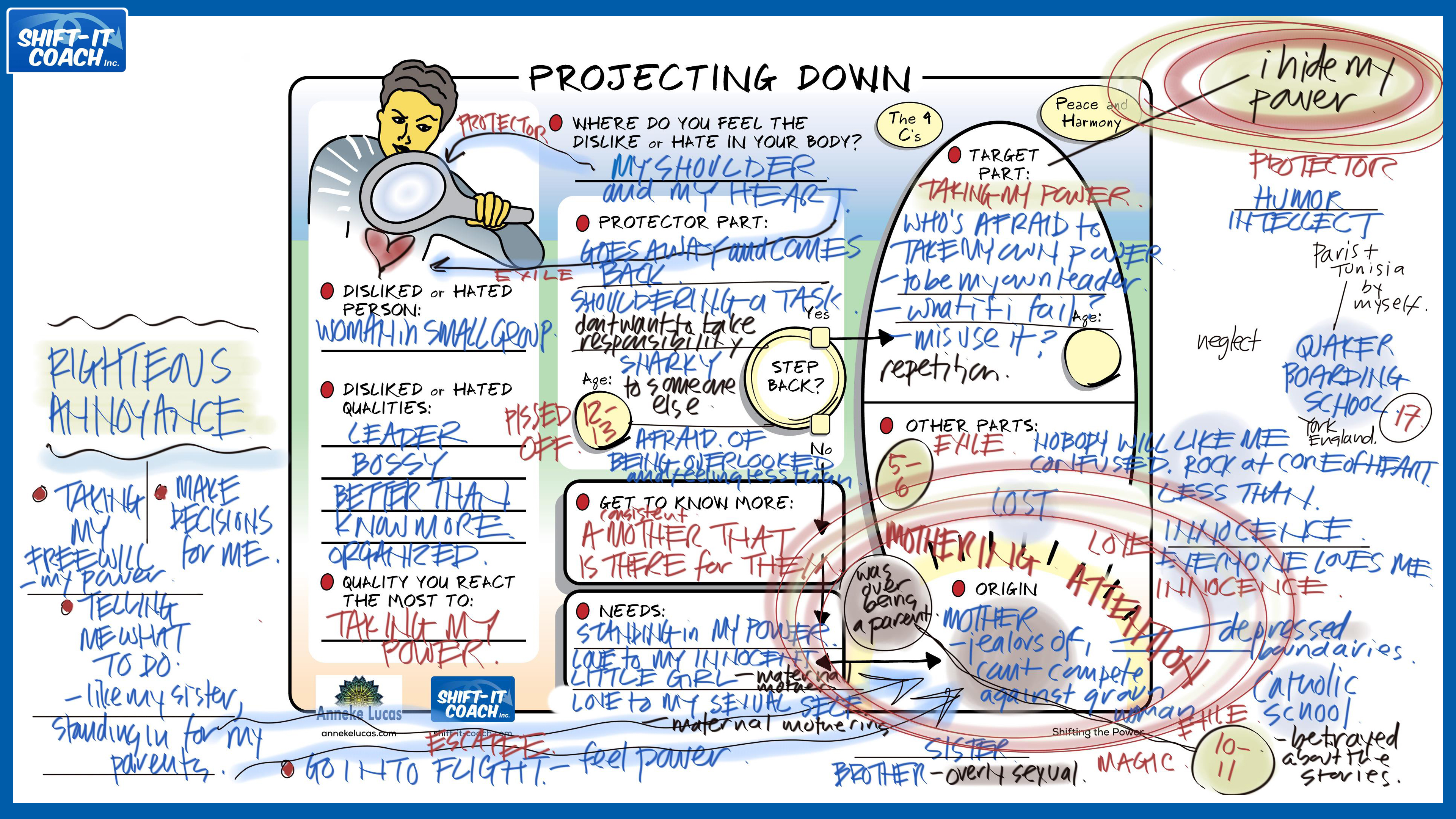 Projecting Down: She owns her inconsistent attendance in Shifting the Power (course with Anneke Lucas and me) and therefore her confusion with its tools. Yet easily identifies a charged situation where she’s righteously annoyed.