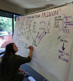 I just finished leading 5 days of beginning and advanced trainings on working visually with groups and individuals (aka Graphic Recording, Graphic Facilitation and Graphic Coaching). As a result, a new cohort of Process Professionals are in the midst of integrating visual skills into their toolkits and practices.